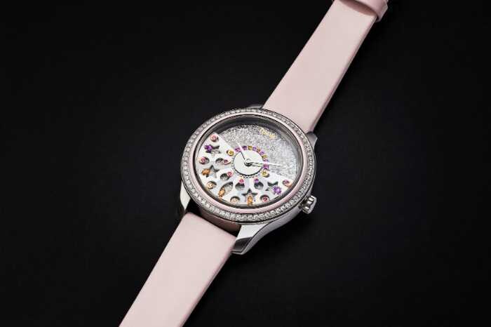 「ディオール グラン バル シルク」のムーブメントには、キャリバー「Dior Inversé11 1/2」を搭載し、オープンワークのイエローゴールド製ローターはホワイトゴールドで装飾されています。