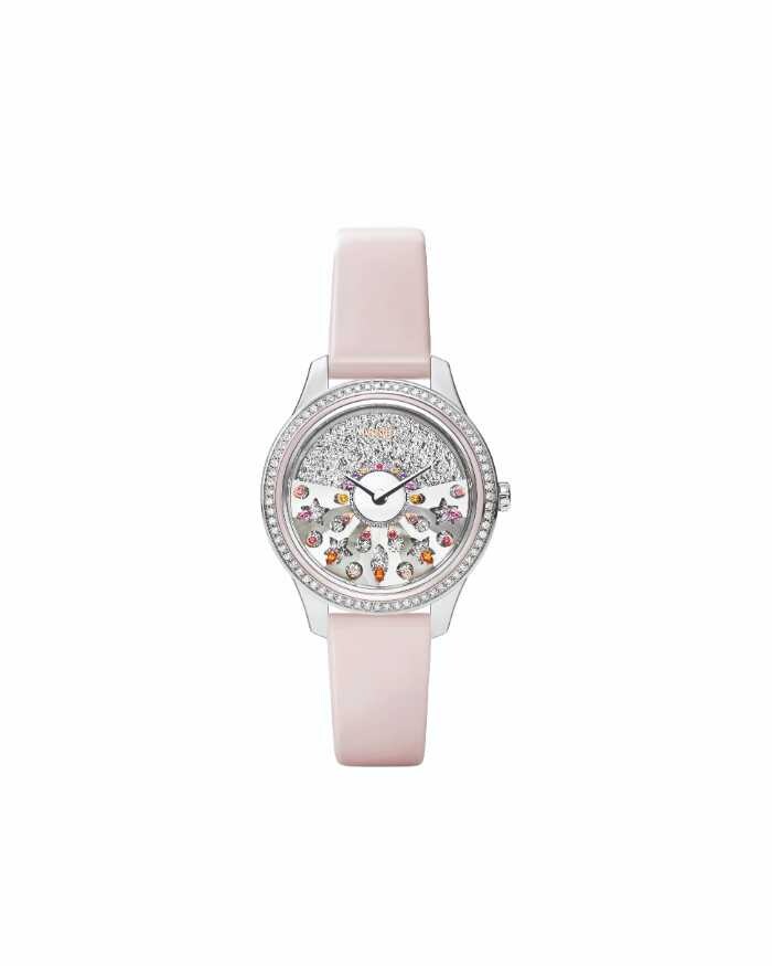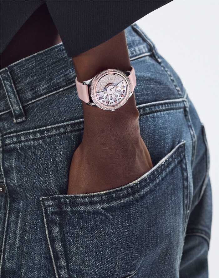 ピンクゴールドの台座にセットされたジェムストーンが揺れ動くたびに、時計全体が華やかな輝きを放ちます。世界数量限定のこのモデルは、ディオールファンにとっては絶対に手に入れたい逸品です。