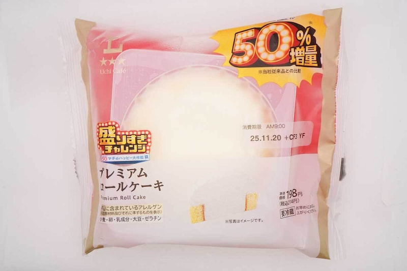 「盛りすぎ!プレミアムロールケーキ」は、従来品「プレミアムロールケーキ」と比較して、総重量を約50%増量しています。