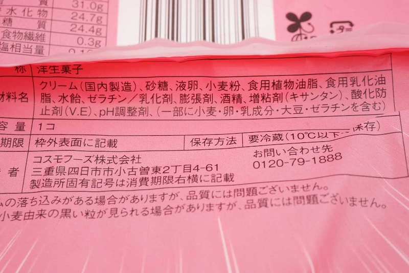 原材料は、クリーム(国内製造)、砂糖、液卵、小麦粉、食用植物油脂などが使用されています。