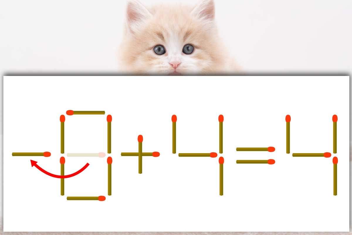 「8」のマッチ棒を1本、「8」の前に移動させて「-」を作り、「-0+4=4」にする。※解答は複数ある場合があります。