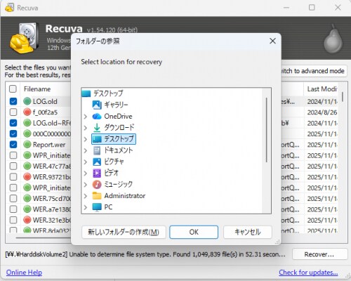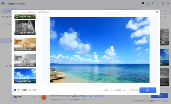 3.プレビューと復元: スキャン完了後、復元したいファイルをプレビューで確認し、チェックを入れ、「復元」ボタンをクリックします。復元先は、必ず元の場所とは別のドライブを選択してください。