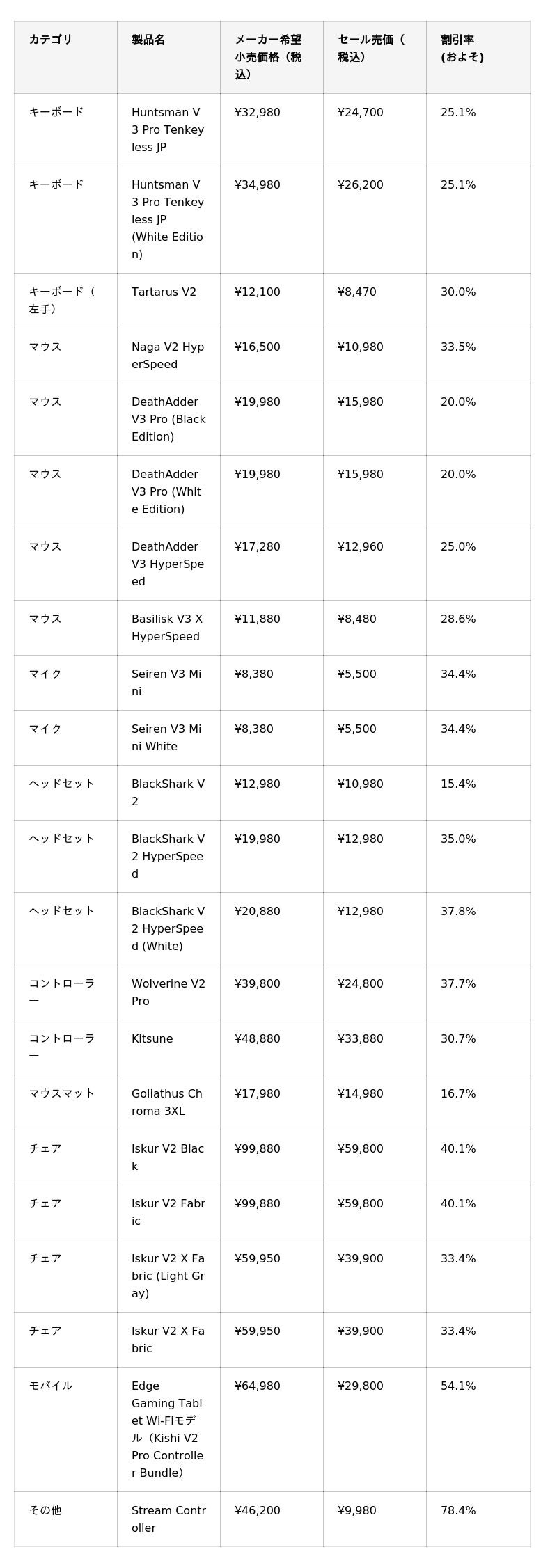 今回のセールでは、話題の新製品に加え、Razerの人気ギアも多数ラインナップ。Razerならではの高性能と個性あふれる製品が、お得に手に入るチャンスです。