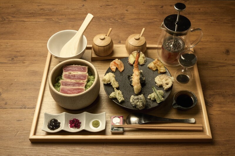 「天ぷら+おひつご飯」は、別皿で提供される揚げたての天ぷらと陶器のおひつに入れたごはんでオリジナルの天丼を完成させるスタイル。ご飯は京都らしく抹茶がブレンドされており、マグロのせやいくらのせなどが選べます。