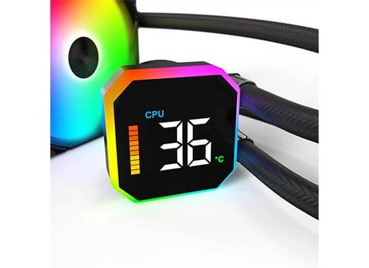 - ポンプヘッドにCPUとGPUの温度をリアルタイムで表示するデジタルディスプレイを搭載。
