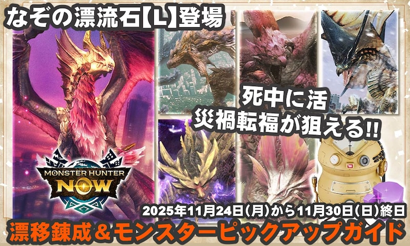 2025年11月24日(月)より位置情報ゲーム『モンハンNow』の最新イベント、漂移錬成&モンスターピックアップが始まる。