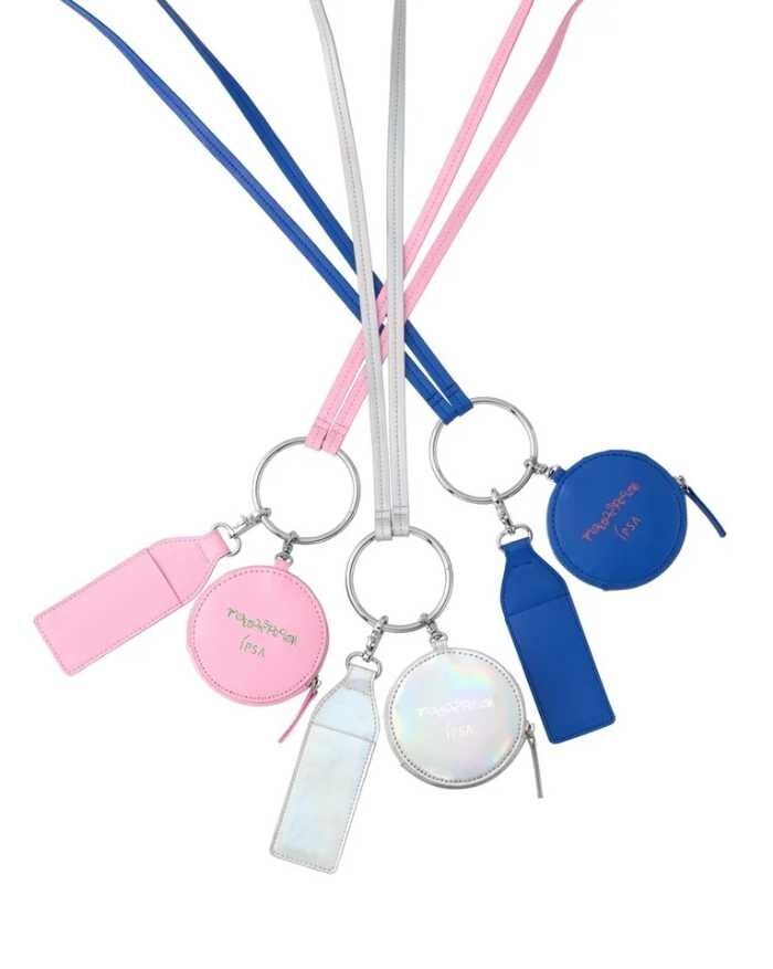 3.コスメマルチリング(ピンク・オーロラ・ブルーから1色選択)…丸型ポーチH90×W90×D25mm、縦型ケースH140×W48mm、ショルダー約111.5cm。小物収納に便利