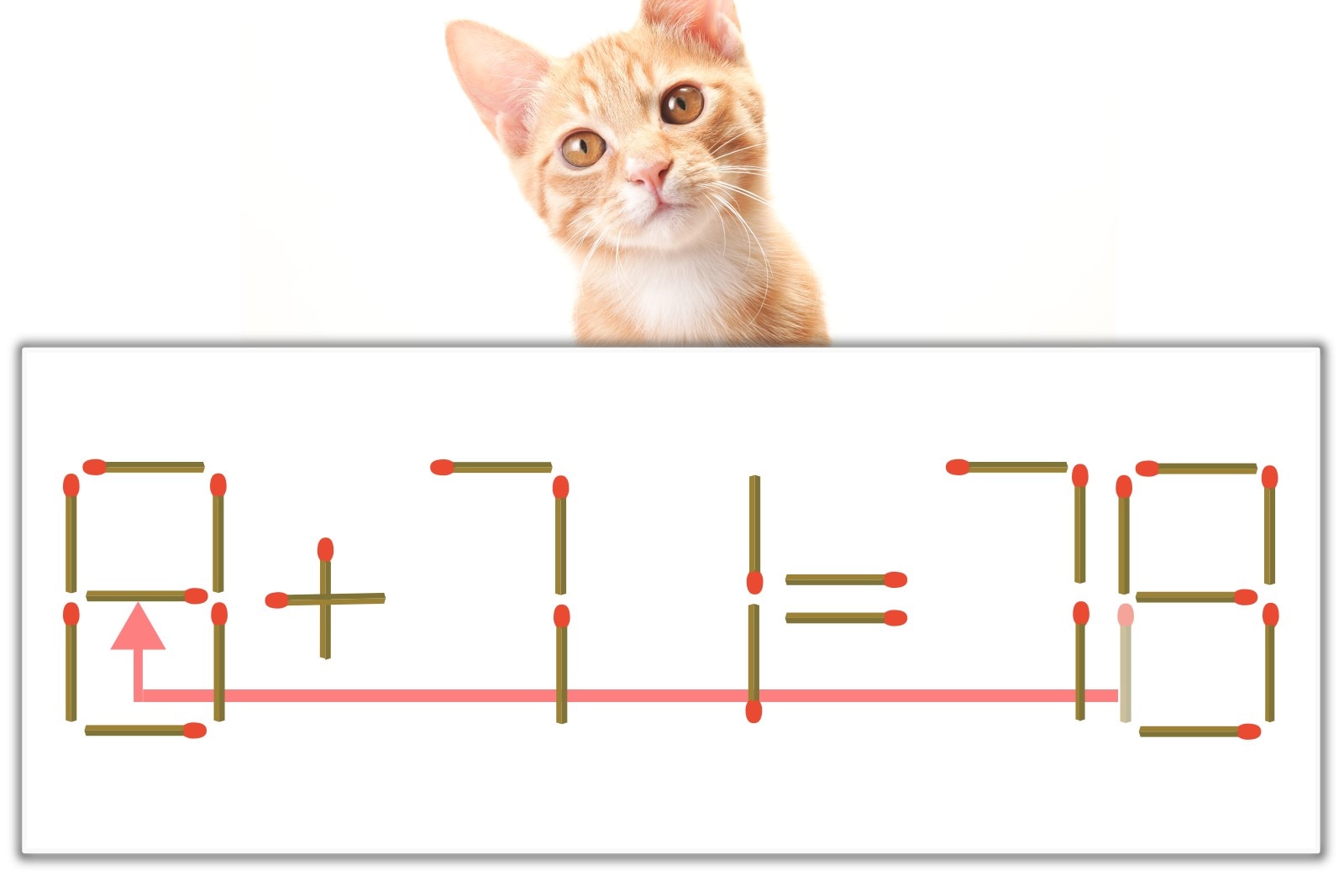 解答の「8」を別の数字に変化させると答えが導き出せます。8のマッチ棒を問題式の「0」に移動させて「8」にしてみましょう。すると、「8+71=79」が成立します。