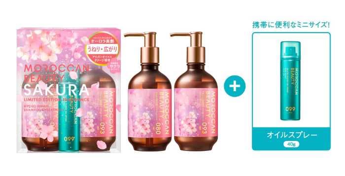モロッカンビューティから春を感じる「サクラの香り」シリーズが数量限定で登場♡アルガンオイル*¹配合のシャンプー・トリートメント・ヘアミルク・ヘアオイルなど、髪の内側と外側から潤いを届けるアイテムが揃います。外出先でのお直しに便利なミニオイルスプレー付きキットもあり、しっとりまとまる艶髪へ導く毎日のヘアケアが特別感たっぷりに楽しめます♪