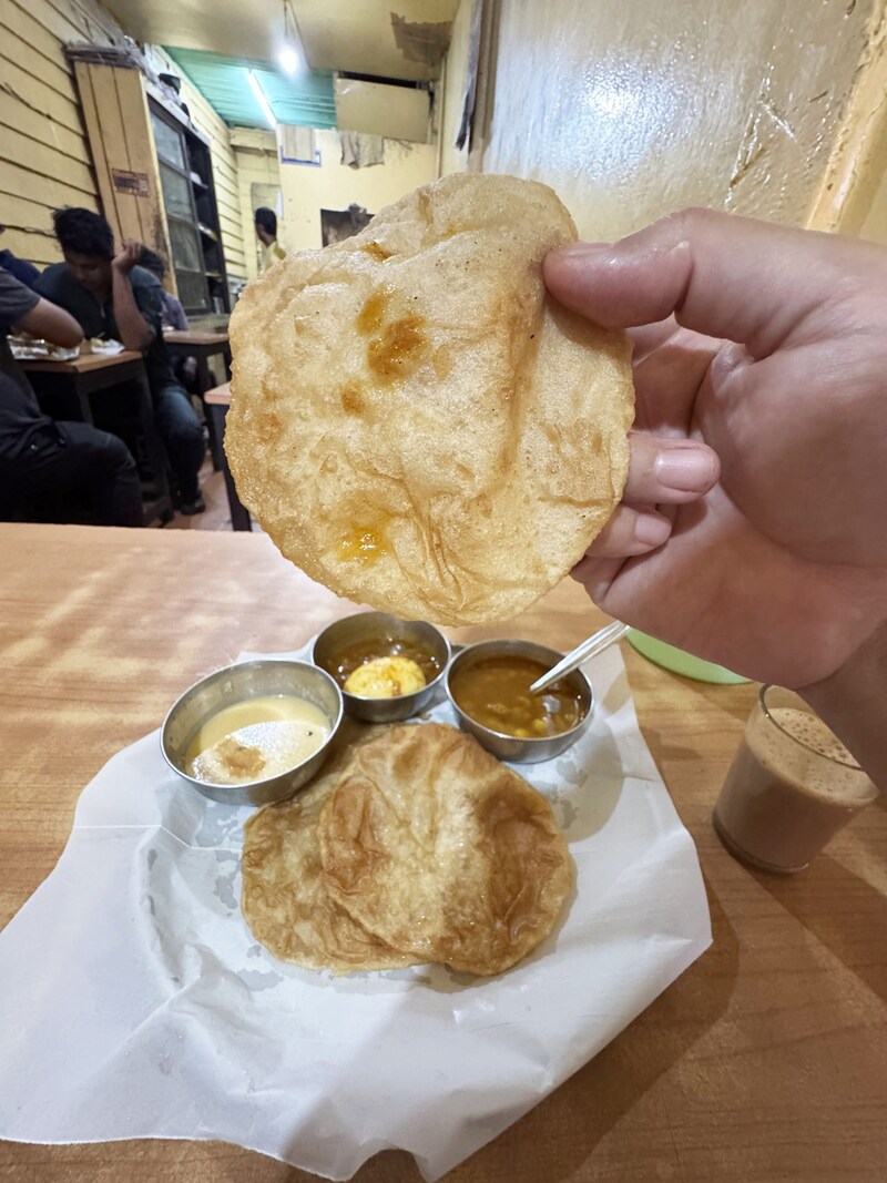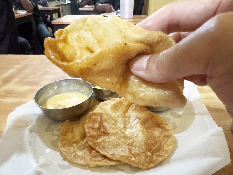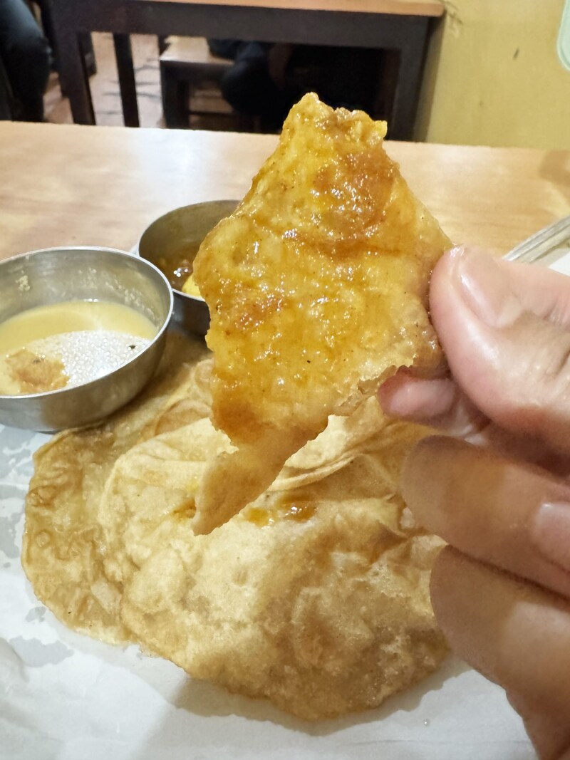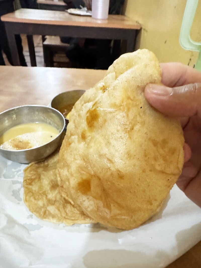 プーリをカレーに浸して食べても良すぎます。カレーは塩分がかなり控えめで、食材の旨味とスパイスで味覚を楽しませるタイプ。プーリの油と生地が、カレーを纏うと、不思議なことに、素朴さが味覚を包みます。複雑ではないのです。シンプルに素朴なテイスト。和食にも通ずるものがあります。