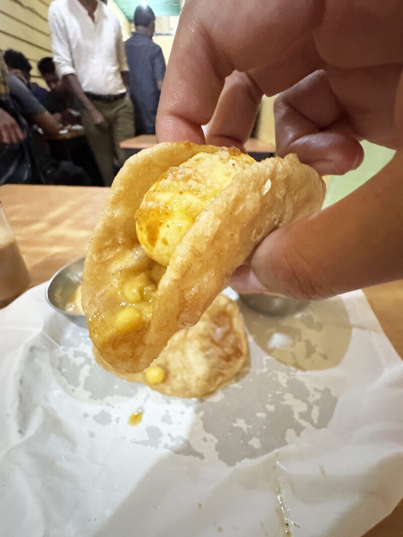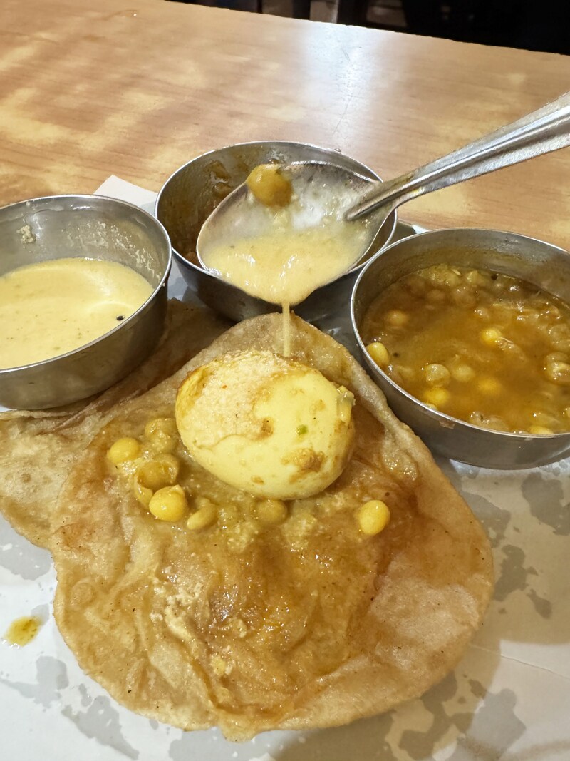 筆者のオススメの食べ方は、カレー煮卵をプーリにのせて、たっぷりとカレーをかけて、そのままカレー煮卵をプーリで包んで食べる方法。これがもう至高。これぞインド式玉子サンドイッチ。スパイシーな煮卵は、まるごとパンで包んで食べてもおいしいのです。