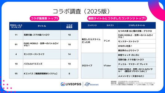 株式会社スパイスマートは、国内のスマホゲームタイトルを対象に1年間のIPコラボ施策を収集し、その調査結果をレポートとして公開しました。