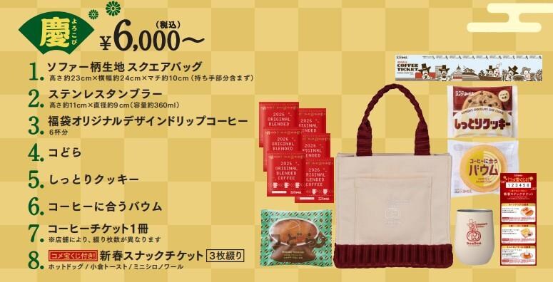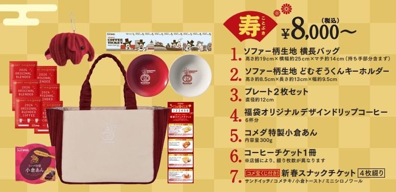 『2026年コメダ珈琲店の福袋』の予約受付は、11月12日から順次開始しています。店舗で予約受付書へ記入し、代金は申込み時に支払いとなります。販売・予約受付の有無、開始・終了日等は店舗によって異なるため、各店舗へ問い合わせしてください。