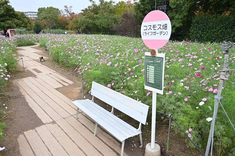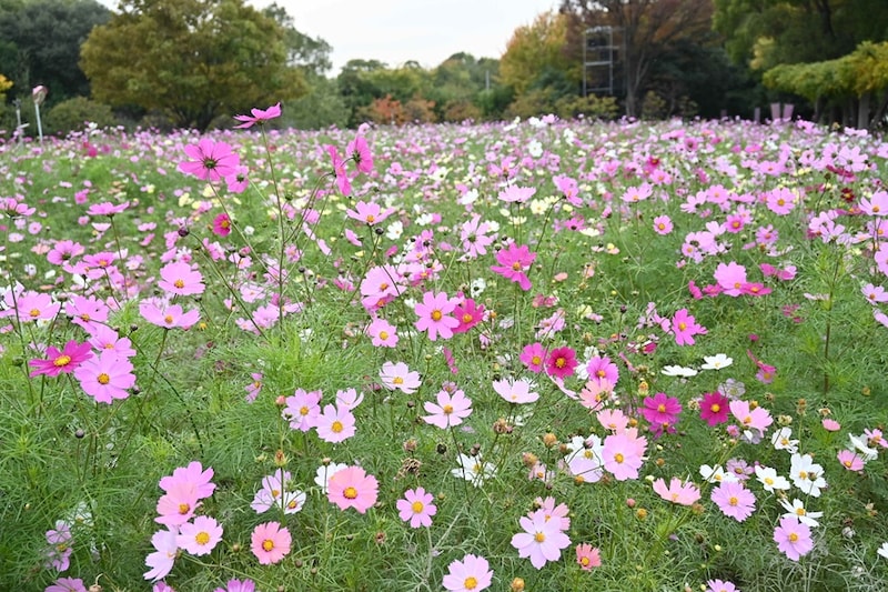 ピンクや白色の花が秋風に揺られてふわり。秋の風物詩、コスモスが大阪市東住吉区の長居植物園でも見ごろを迎え、一面にピンク色のじゅうたんが広がっています。