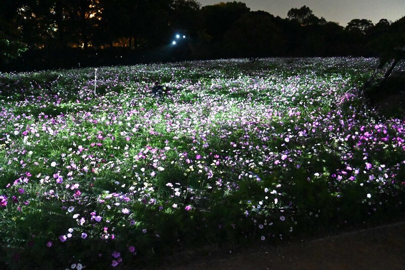 午後6時からは長居植物園の自然を活かした夜の野外ミュージアム「チームラボ ボタニカルガーデン 大阪」となり、コスモスが光り輝く作品『生命は闇に浮かぶまたたく光 - コスモス』へと様変わりします。
