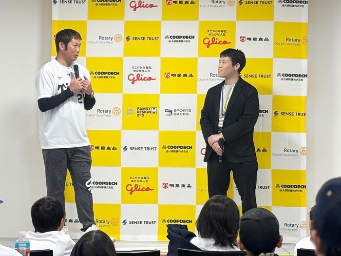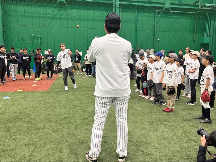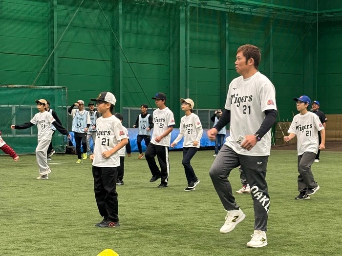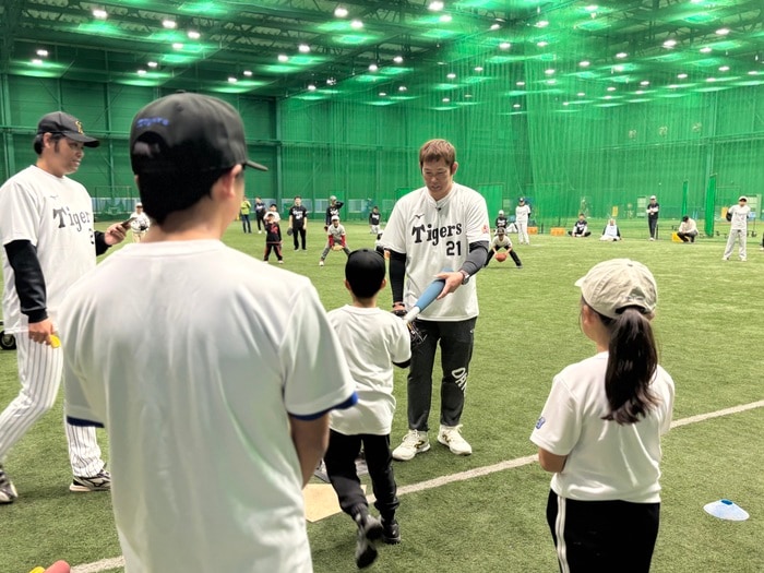 打撃や守備の練習では、低学年〜高学年の2チームに分かれて、野球のプロから直接指導を受けるという夢のような体験!この日のイベントでは、指導役の先生として、来季から2軍投手コーチとなる桑原謙太朗アカデミーコーチも参加されました。
