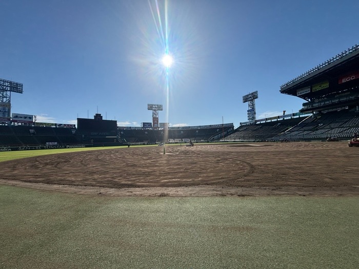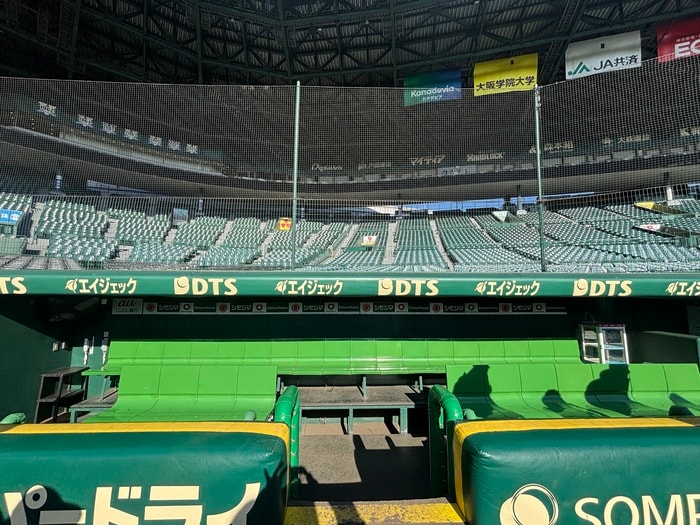 ベンチからは、広々とした阪神甲子園球場を見渡すパノラマ