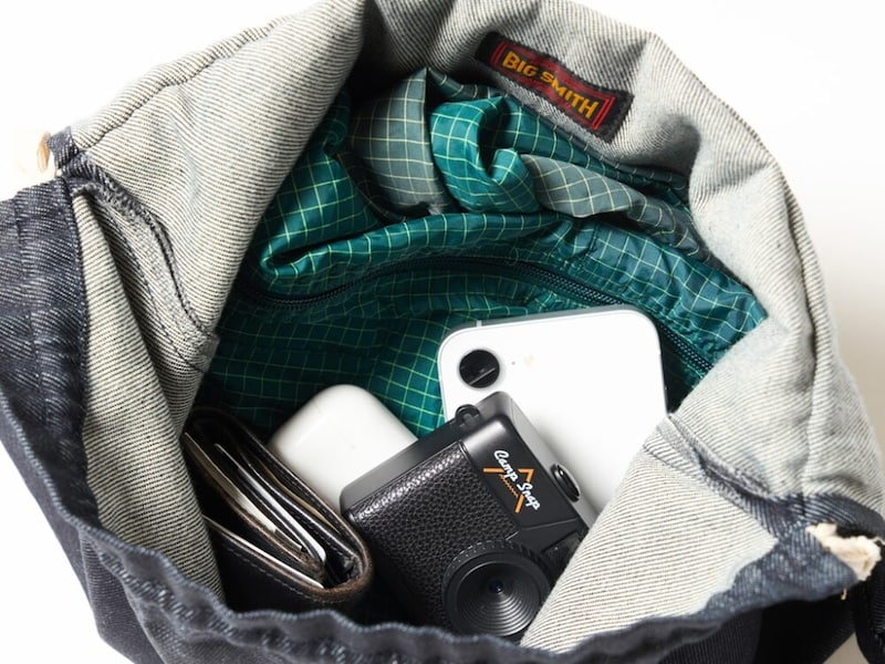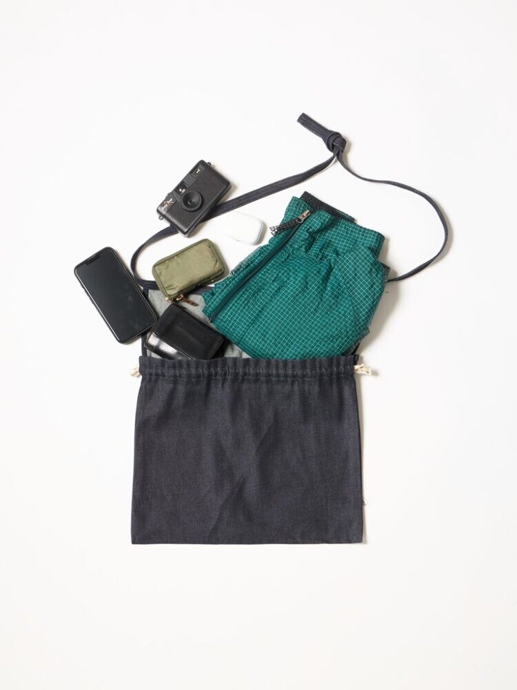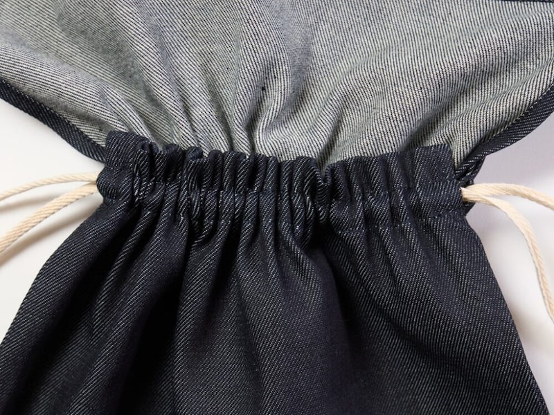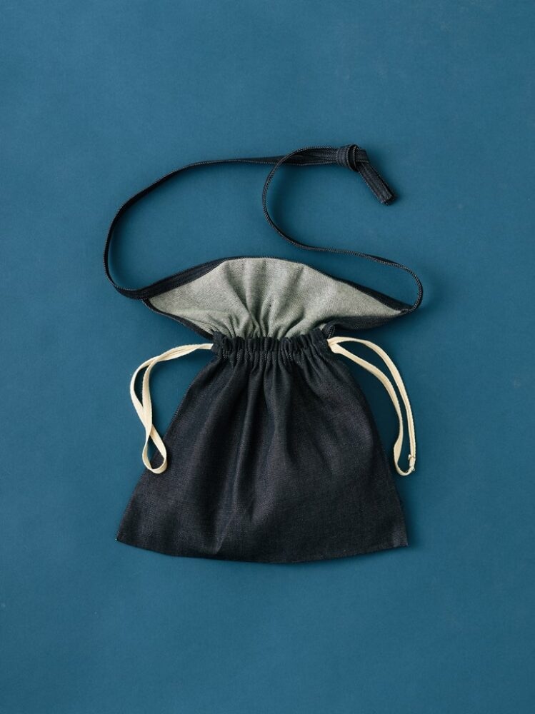 近年、男女ともに多くみられるようになりつつある巾着バッグ。こちらもドローコードを絞れば巾着袋として使用することが可能だ。この部分のデニムの経年変化も楽しみである。