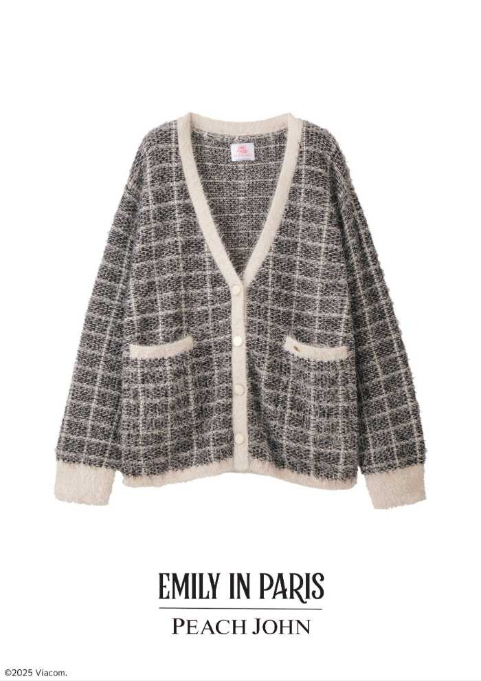「ホイップリーツイードラメカーディガン」は、柔らかなチェック柄フェザーヤーンにラメ入り糸、ゴールドボタンで高級感を演出。左ポケットにロゴプレート付き、ワンサイズで5,900円(税込)。
