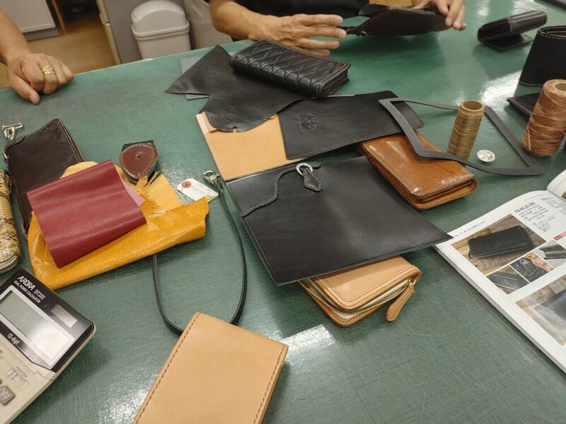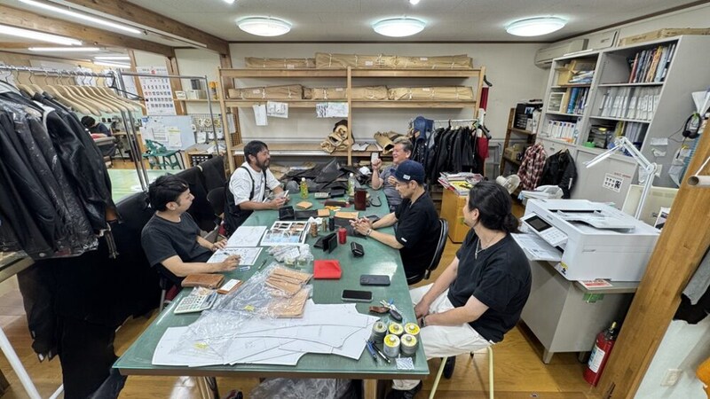 訪れたのはフラットヘッドの自社工房であるストックバーグ。革小物やレザージャケットなど、革製品を中心に製造をしているところなんです。そこで実際の製品を見ながらマネージャーの宮坂さんを始め、スタッフの皆さんとああでもないこうでもないと打合せを重ね、仕上がったのがこのウォレットです。