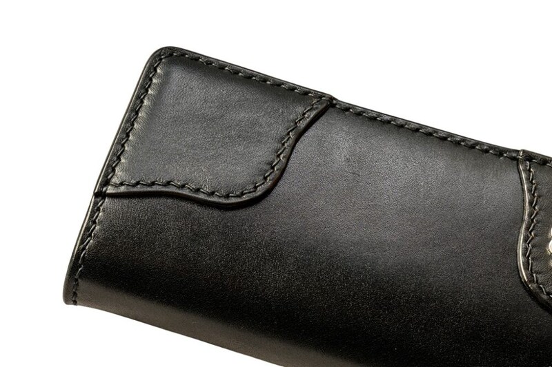 ウォレットの本体に使っているのは栃木レザーの多脂革。ベジタブルタンニンで鞣した牛革で、仕上げにオイルをたっぷり含ませているのに柔らかすぎないコシのある質感が特徴です。この革は使い込むほどに艶が出て、独特の光沢感が楽しめます。