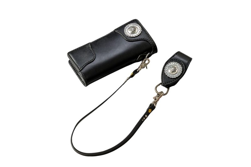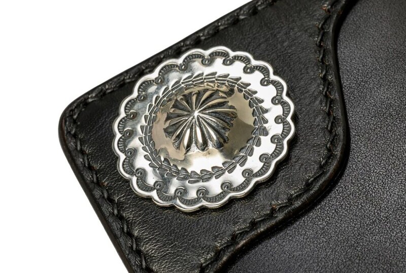 スタンプワークを施したオリジナルシルバーコンチョ。使い込むほどにコントラストが強調され経年変化も楽しめます。シルバーコンチョバージョンにのみウォレットとループホルダーに1個ずつ取り付けられます。