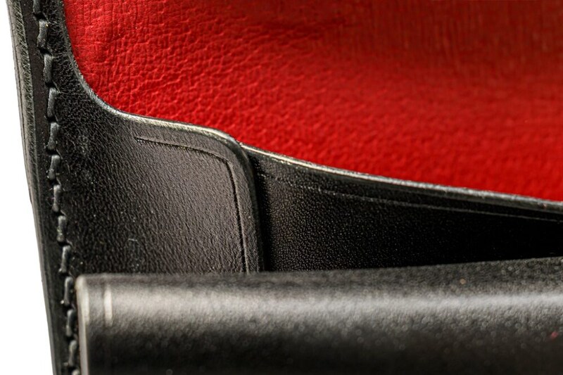 札入れ部分は口が大きく広がるスライドマチ構造になっていて、札の出し入れがスムーズにできます。この構造は革への負担が少ないので、札入れ部分の革が裂けにくくなります。