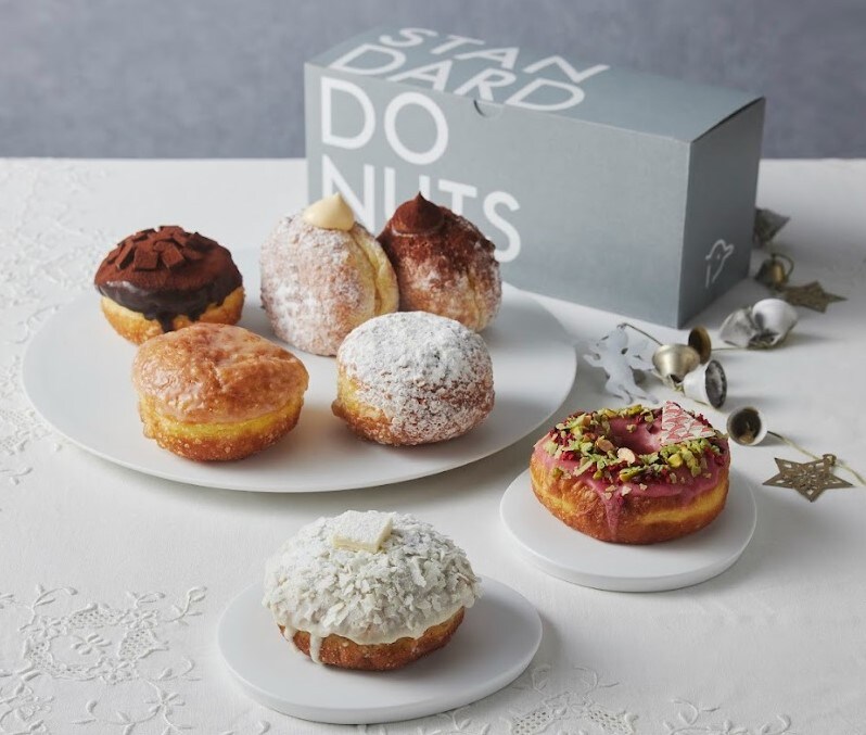 スタンダードドーナツ(上)「ドーナツ」(スタンダード・黒糖きな粉・ダブルショコラ・カスタード・ガナッシュショコラクリーム)(1個/270円〜、5個セット/1,620円)、(下)「白いドーナツ」(454円)、(右)「クリスマスリースドーナツ」(454円)※「白いドーナツ」「クリスマスリースドーナツ」は阪急うめだ本店限定、各日限定50