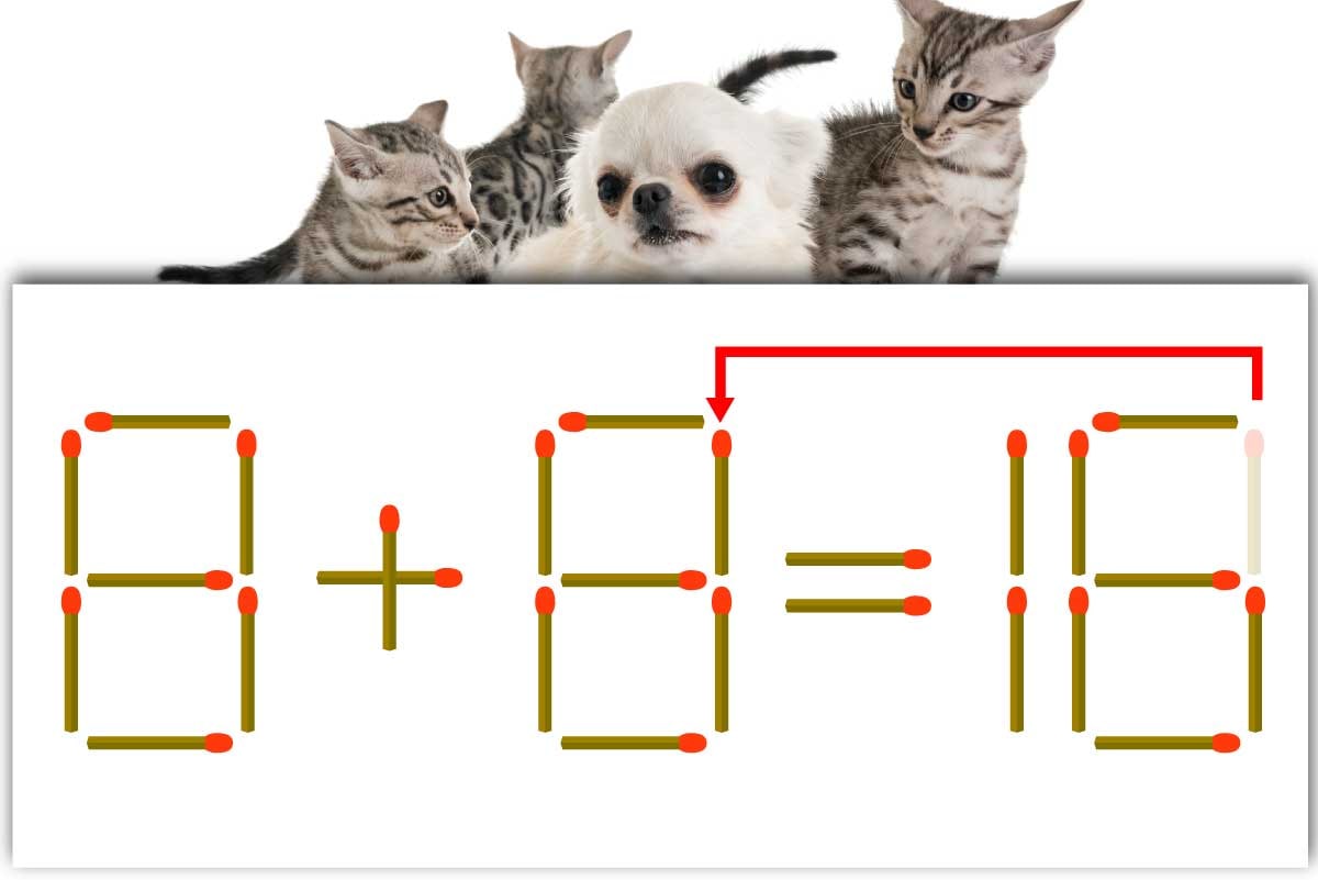 「8」のマッチ棒を1本、「6」に移動させて「8」を作り、「8+8=16」にする。※解答は複数ある場合があります。
