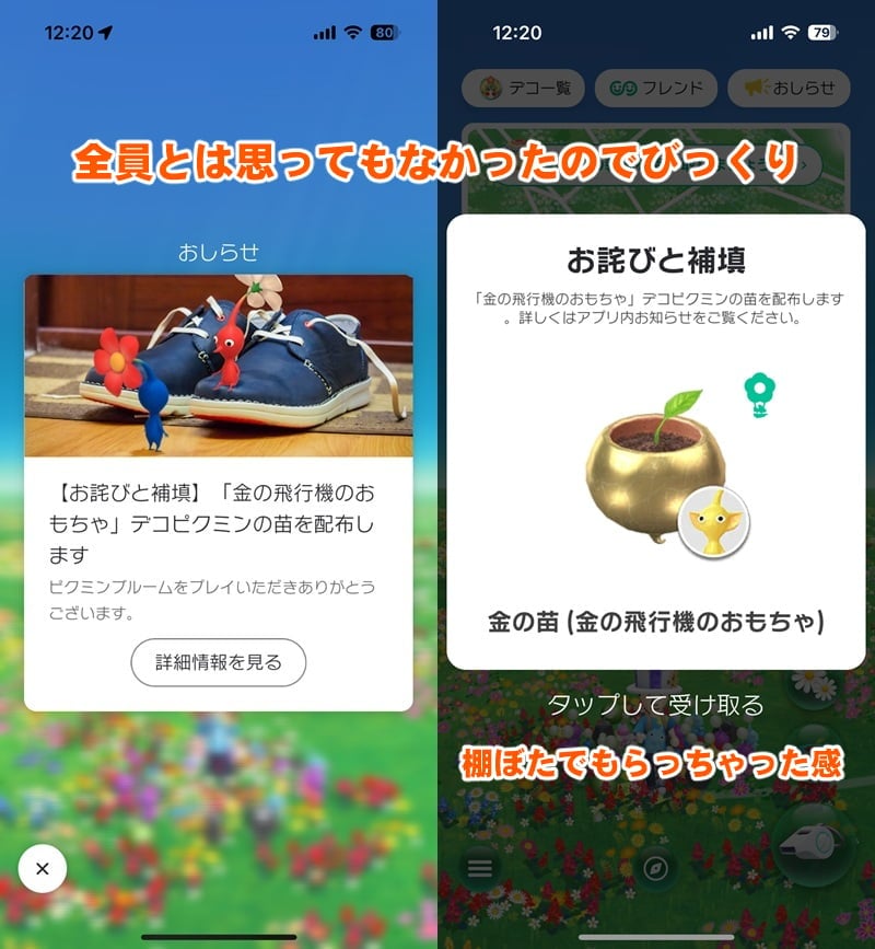 そして前日“お詫びと補填”というアナウンスと合わせて全ユーザーに配布された“金の苗”についてリポート。