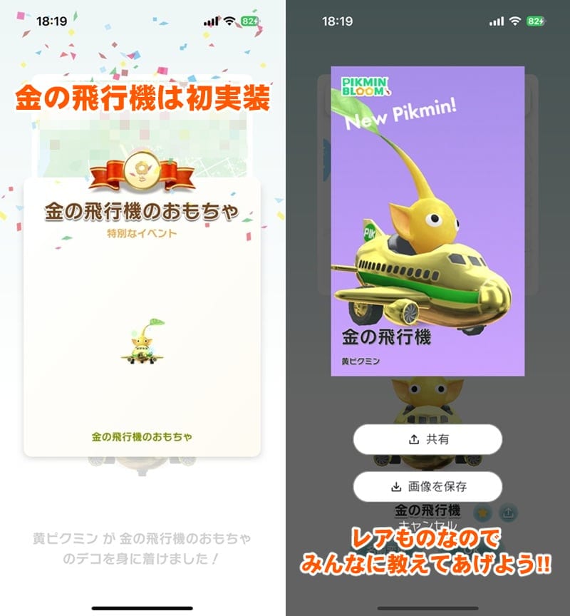 先日より全プレイヤーを対象に“金の飛行機のおもちゃ”を身に付けたデコピクミンの苗が配布を開始。