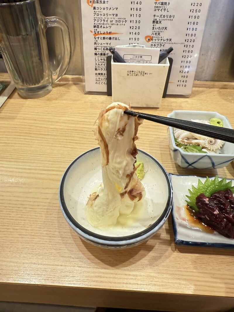 待つことしばし、「のび~るモッツァレラ」登場。鰹節にわさびがついている。んで、箸でつまむと「のび~る」。あったかいモッツァレラチーズ、ビール(ノンアルだけど)にもよくあう。