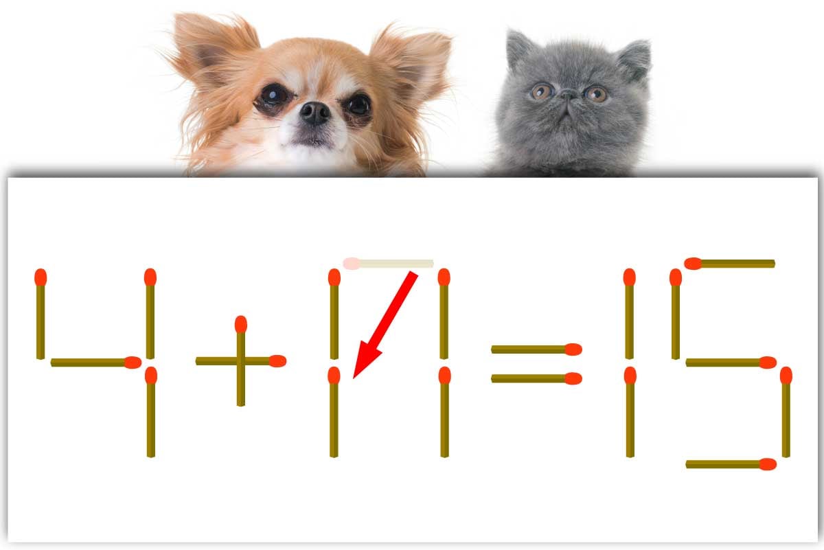 「7」のヨコ向きのマッチ棒を1本、左下に移動させて「11」を作り、「4+11=15」にする。※解答は複数ある場合があります。