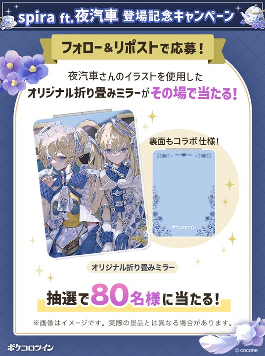夜汽車さん描き下ろしのキービジュアルを使用した「オリジナルミラー」を、『ポケコロツイン』公式のXアカウントをフォロー&指定ポストをリポストし、キャンペーンサイトでご自身のXアカウントを連携された方の中から抽選で80名様にプレゼントします。