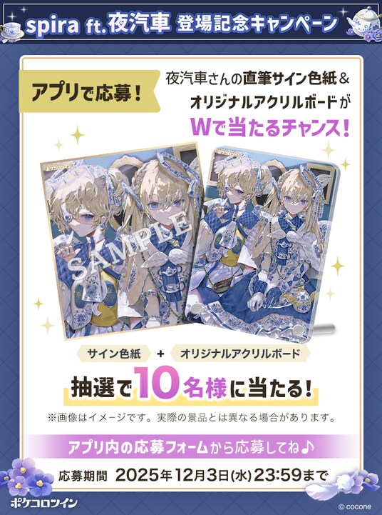 夜汽車さん直筆サイン色紙と描き下ろしのキービジュアルを使用したオリジナルアクリルボードを、抽選で10名様にプレゼントします。『ポケコロツイン』のアプリ内から応募できますので、この機会にぜひ遊んでみてください。