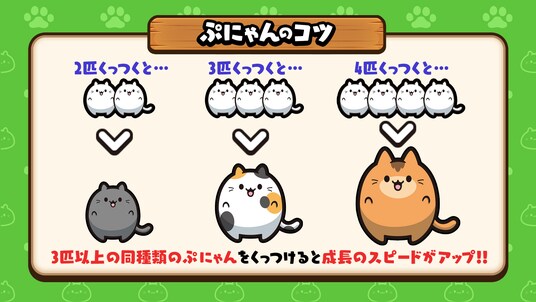 同種類のぷにゃんをくっつける数が多いほど、成長スピードがアップ!2匹より3匹、3匹より4匹と、たくさんつなげて効率よく成長させよう。