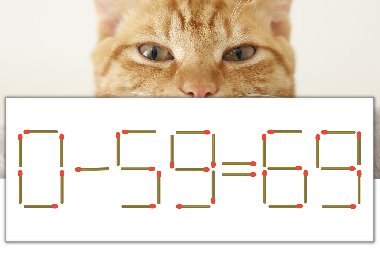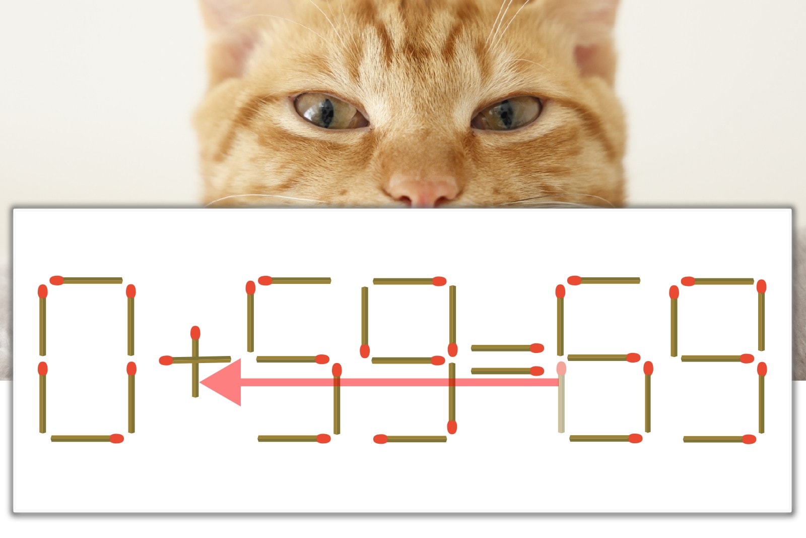 「6」を別の数字に変化させると答えが導き出せます。「6」のマッチ棒を1本移動して、「-」を「+」にしてみましょう。すると、「0+59=59」が成立します。