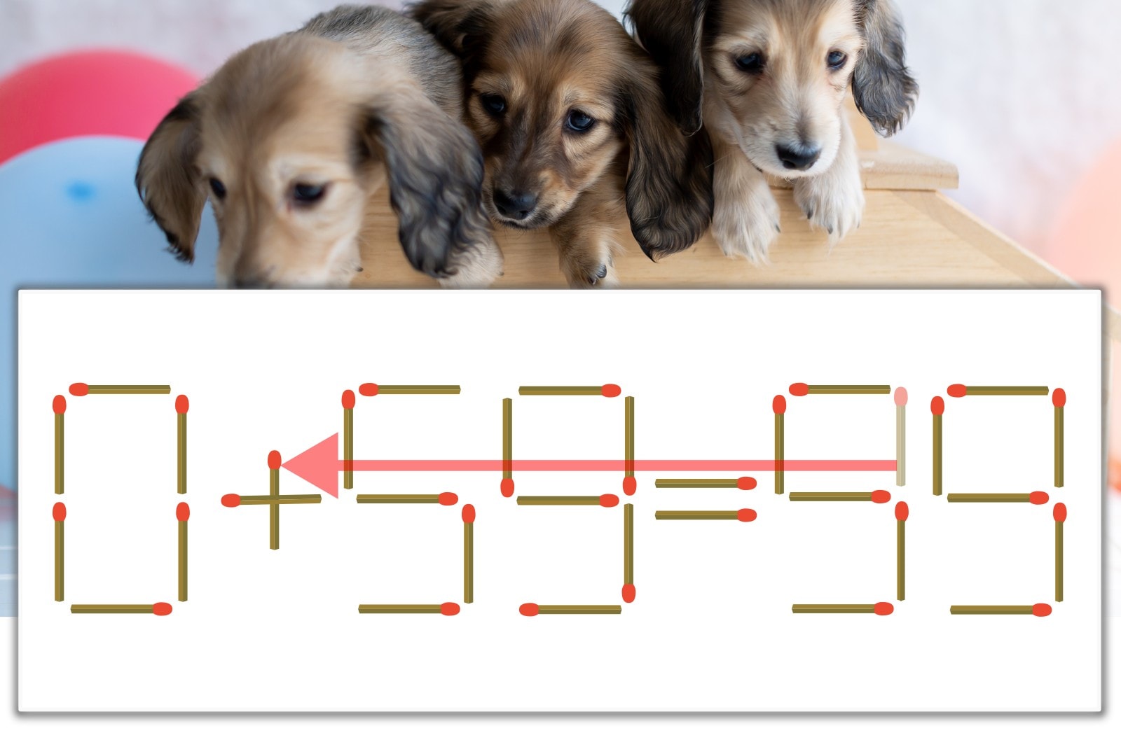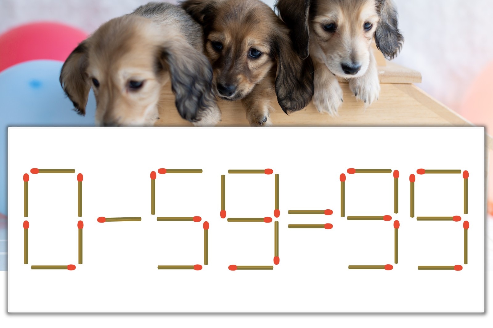 「9」を別の数字に変化させると答えが導き出せます。十の位の「9」のマッチ棒を1本移動して、「-」を「+」にしてみましょう。すると、「0+59=59」が成立します。