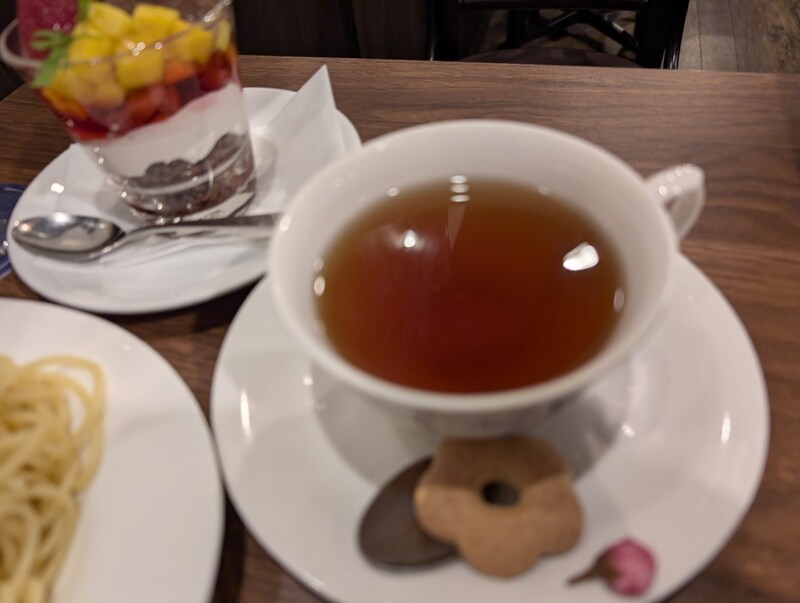 そして「サクヤとキャサリンのフラワーティータイム」。880円(税込)で、テイクアウトは864円(税込)。バラ紅茶・桜の塩漬け・そば粉菓子 のホットドリンクで、2人の着物の柄である桜とバラをモチーフに和洋折衷の味わいの一杯に仕立ててあります。バラの香りのする紅茶に、桜の塩漬けをのせたそば粉菓子をトッピングしてあり、風情も感じます。