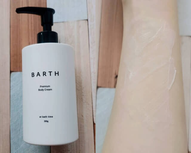 入浴後の濡れた肌にも乾いた肌にも使える2wayタイプのBARTH の「プレミアムボディクリーム at bath time」。のびの良いテクスチャーで、ベタつかずしっとりうるおいます。