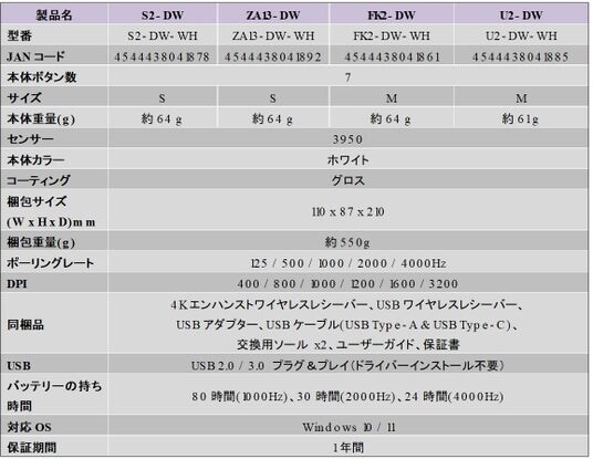 「S2-DW」「ZA13-DW」「FK2-DW」「U2-DW」製品仕様表