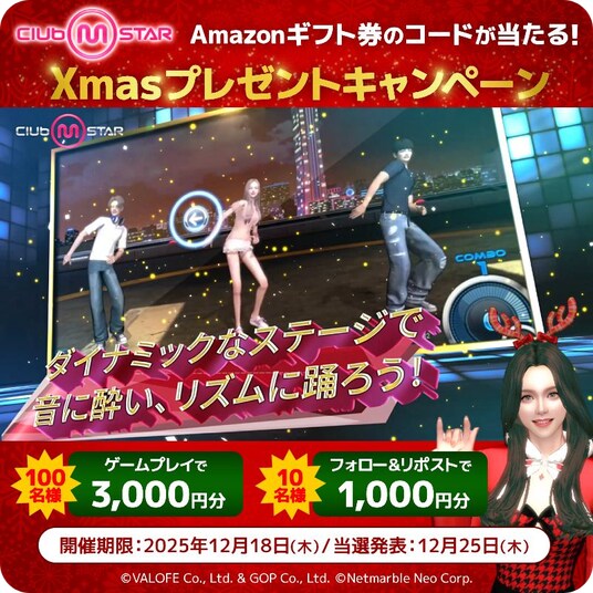 『クラブ・エム・スター』は、ダンスパフォーマンスの爽快さやアバター表現の幅広さに加え、仲間との交流を楽しめるコミュニティ要素を特徴としています。今回のキャンペーンは、ゲームを遊ぶほどチャンスが増える仕組みを取り入れ、気軽に参加できる“季節の楽しみ”として企画しました。クリスマスに向けてキャラクター育成や仲間づくりを進める中で、自然と条件を達成できる構成となっており、「いつものプレイがちょっと特別になる」体験を届けることを目指しています。ゲーム外から参加できるフォロー&リポスト企画も用意し、幅広い方に気軽に参加していただける内容にしています。