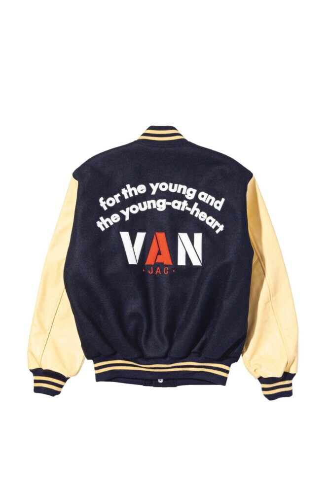 ボディにメルトン、袖に牛革を使用した定番のスタジャン。背面にはアップリケ刺繍が施され、付属のワッペンは好みの場所に縫い付けてカスタムを楽しめる。9万7900円