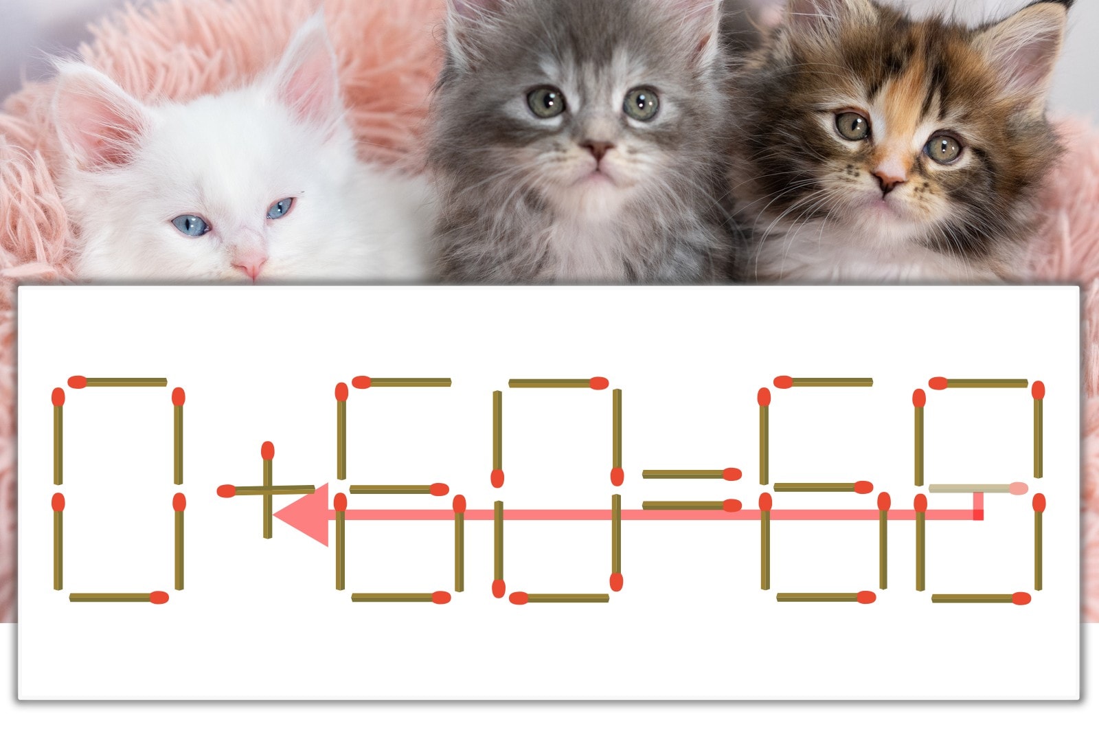 「8」を別の数字に変化させると答えが導き出せます。「8」のマッチ棒を1本移動して、「-」を「+」にしてみましょう。すると、「0+60=60」が成立します。