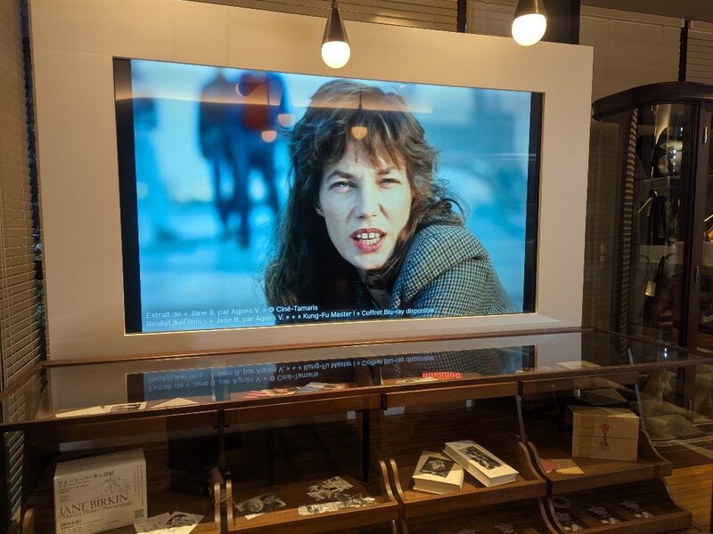 オリジナルバーキンの展示ルームに行く前に、2階の展示を拝見。ジェーン・バーキン関連書籍などがケースに並んでいて、モニターにはオリジナルバーキンについての映像が流れています。この世界的なバッグを競り落としたオークションの風景も見ることができました。