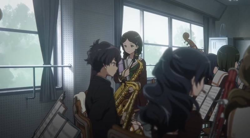 久美子(CV:黒沢ともよ)が後片付けをしていると、教室の窓際で話し込む先輩たちの会話が漏れ聞こえてきた。
