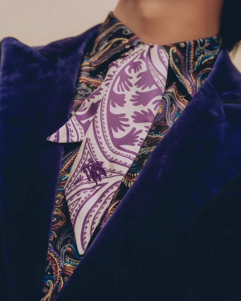深みあるトーンのベルベットのセットアップや煌めきを湛えたジャカードなど、エトロのクラフツマンシップが息づくスタイルが、ホリデーの世界観を立体的に映し出す。