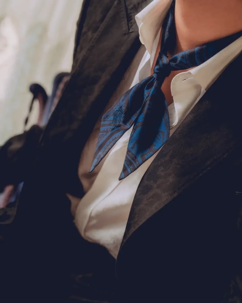 胸元にのぞくのは、アイコニックなミニスカーフ「ペイズリーナ」。