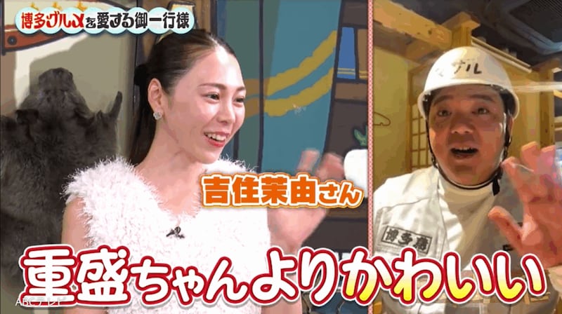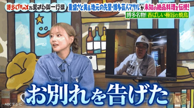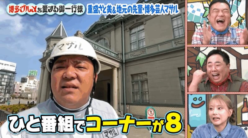 バラエティ番組『ザキ山小屋』(ABCテレビ)に出演した重盛は、博多駅から徒歩2分の場所に住んでいた根っからの博多っ子だ。彼女の先輩とは、博多で芸人として活躍している、吉本興業所属のマサル。マサルはレギュラー1番組で8コーナーも担当する売れっ子で、多忙過ぎるスケジュールの関係から、『ザキ山小屋』にリモートで出演した。