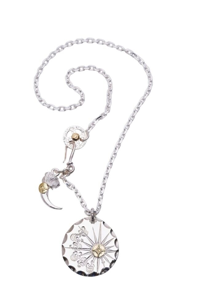 メタルのデザインはアシンメトリーになっており、ゴールドの位置が右寄りのため、チャームをつける場合は、左側につけることがポイント。「ゴールドがメタルとクロウ、メディスンホイールの3点についています。太陽のゴールドから外側に攻めていくと、ゴールド同士が重ならず見栄えもよくなりますね。攻めるならチャームぐらいにとどめておくのがベスト」。ちなみにフックの位置は真後ろではなくあえて前に持ってきて見せるのがファーストアローズ流。ゆえにメディスンホイール付きのチェーンかフックにチャームをつけるとより華やかに。